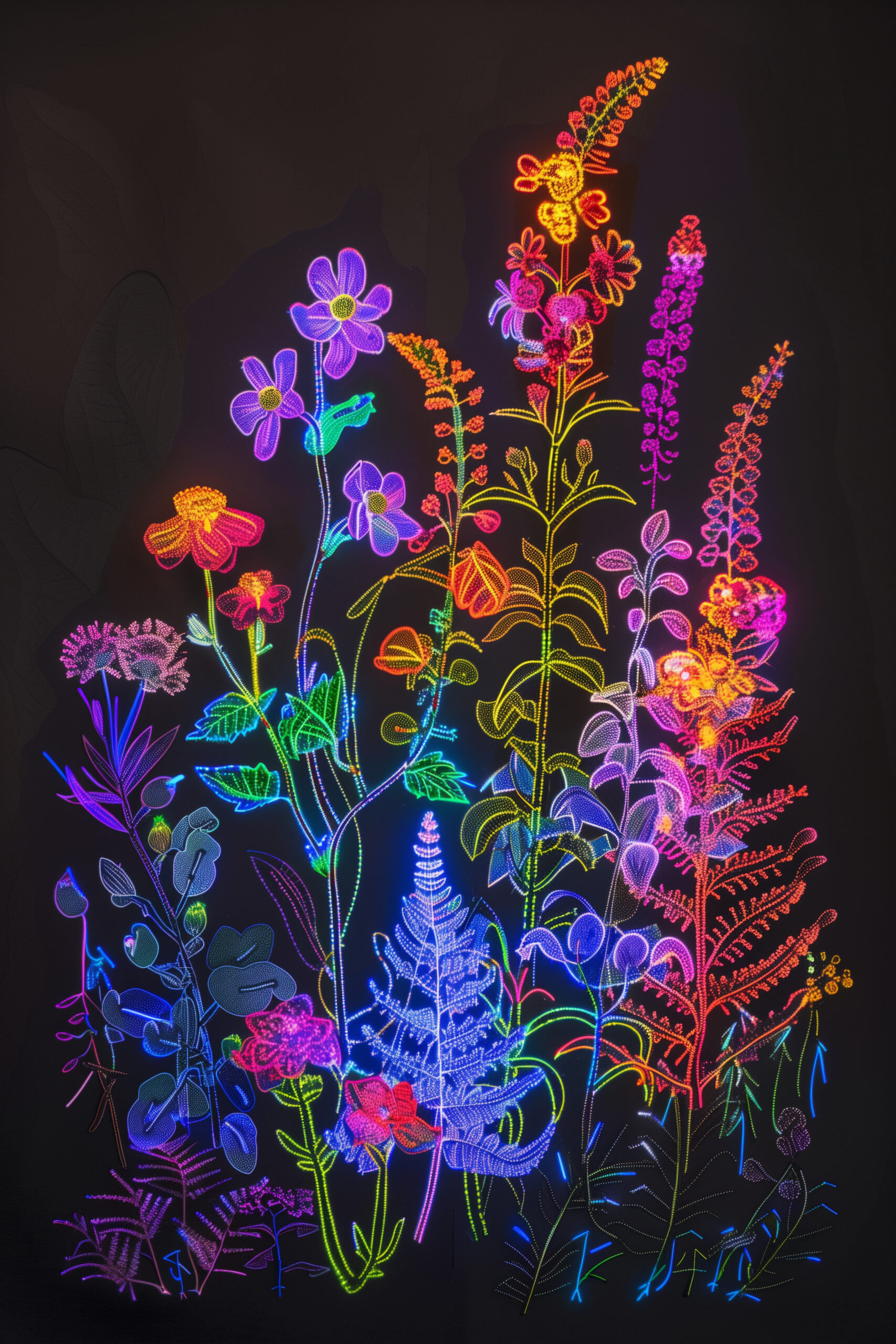 An illuminated drawing of wildflowers and ferns, illuminated in the style of neon lights, on a black background, in a colorful style, with whimsical floral designs, vibrant, high resolution, hyperrealistic, surreal, beautiful, with intricate details. --ar 2:3 Job ID: 60fd020b-9009-48e4-815d-e36bf9b197a9